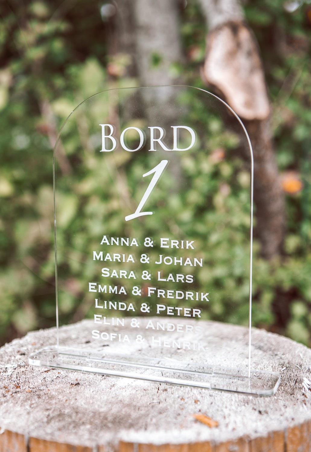 Bordsplaceringsskylt i akryl med namn på alla som sitter vid bordet.