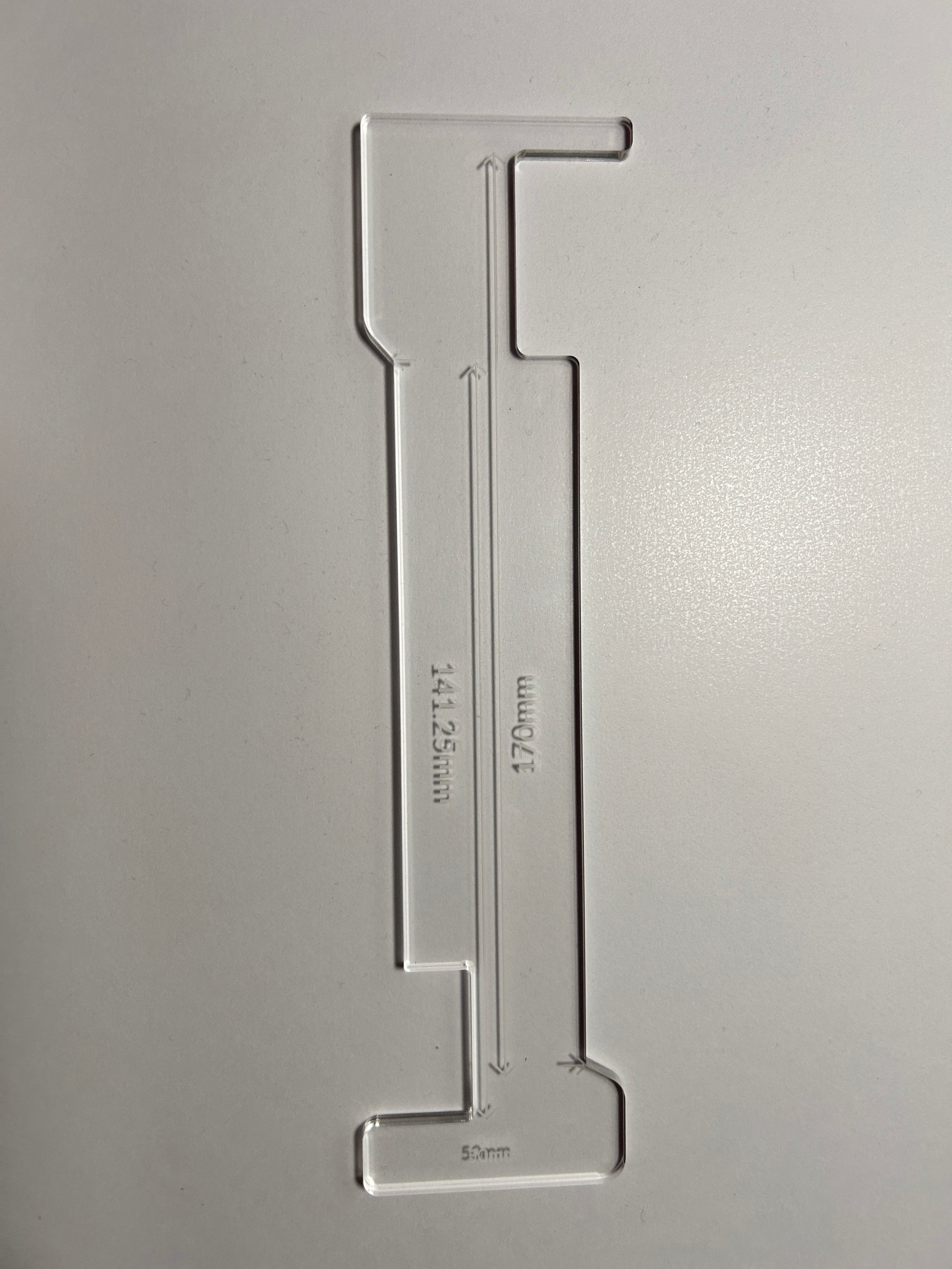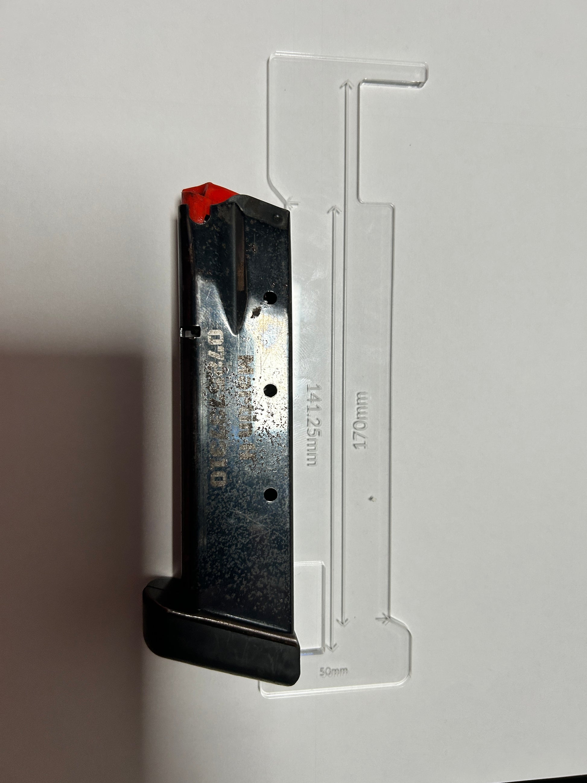 Laserskuret mått för att mäta in magasin i IPSCgrenar som begränsar magasin till 141.25 och 170mm.