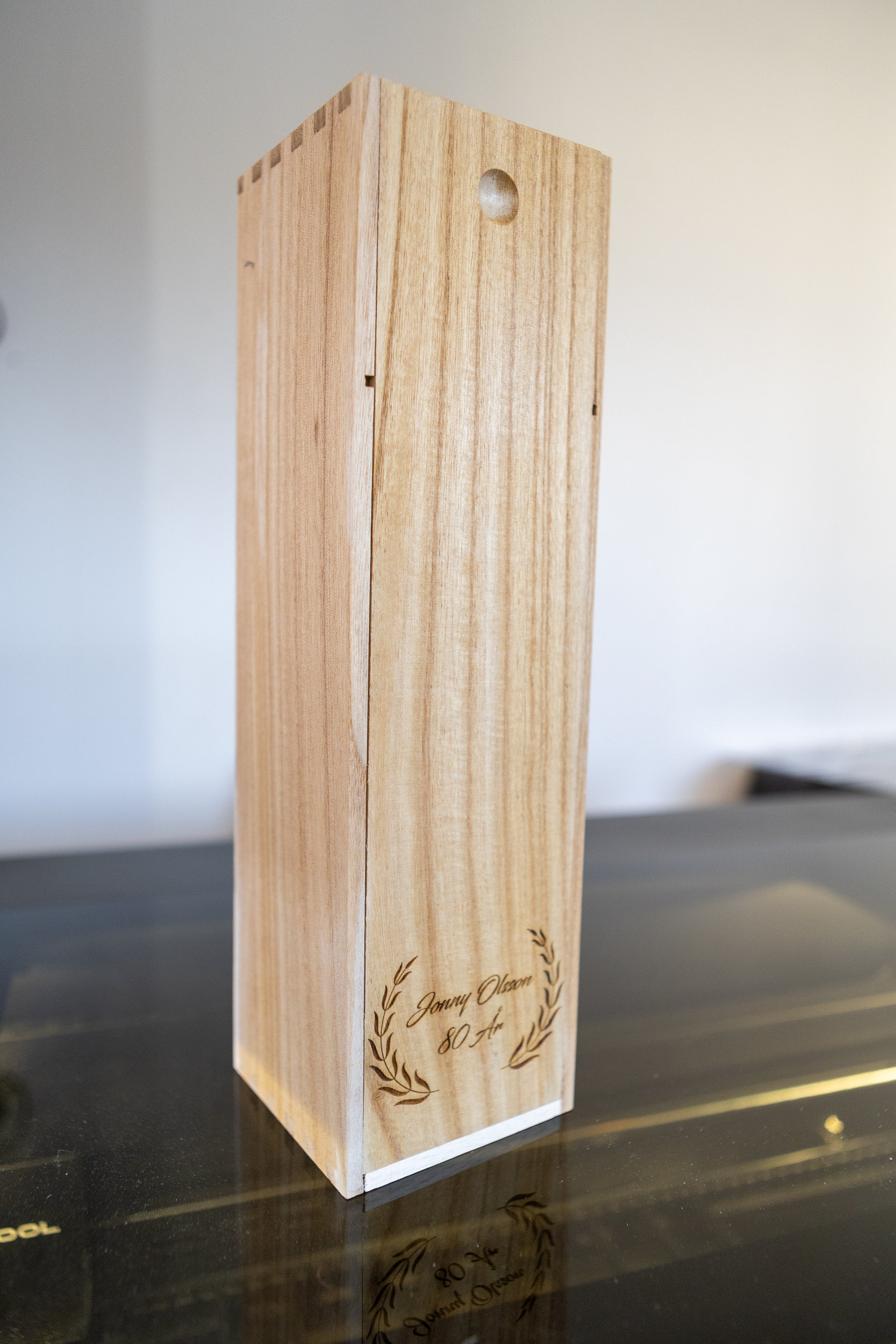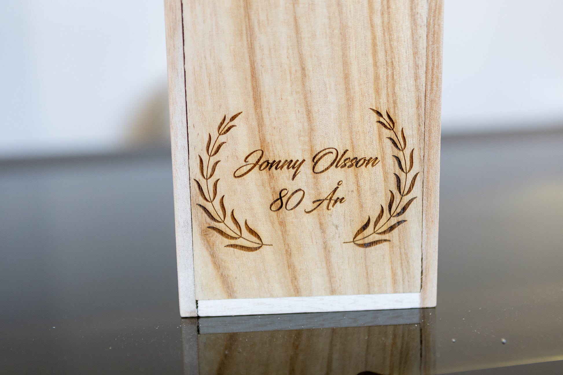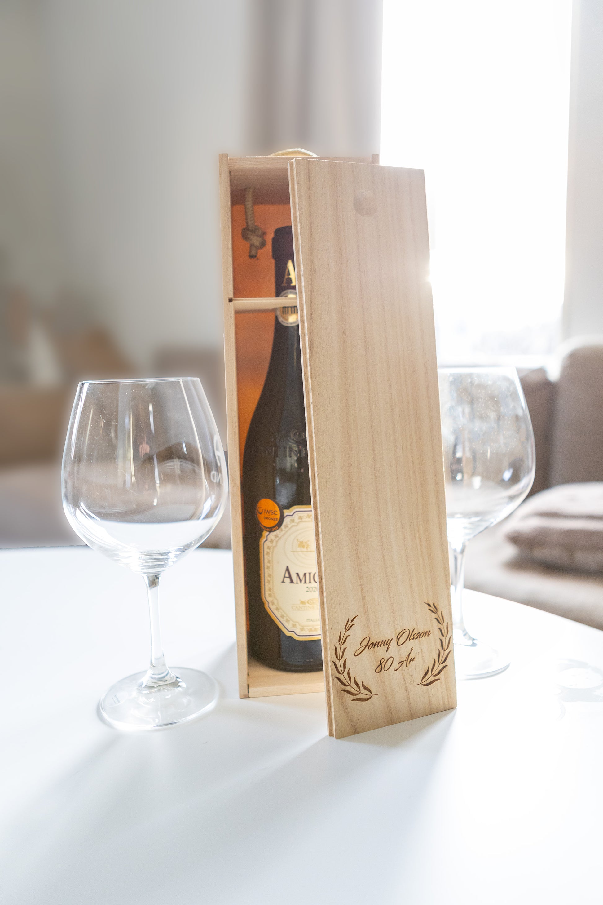 Vacker vinlåda i ljust trä med personlig gravyr till födelsedagen eller andra högtider.